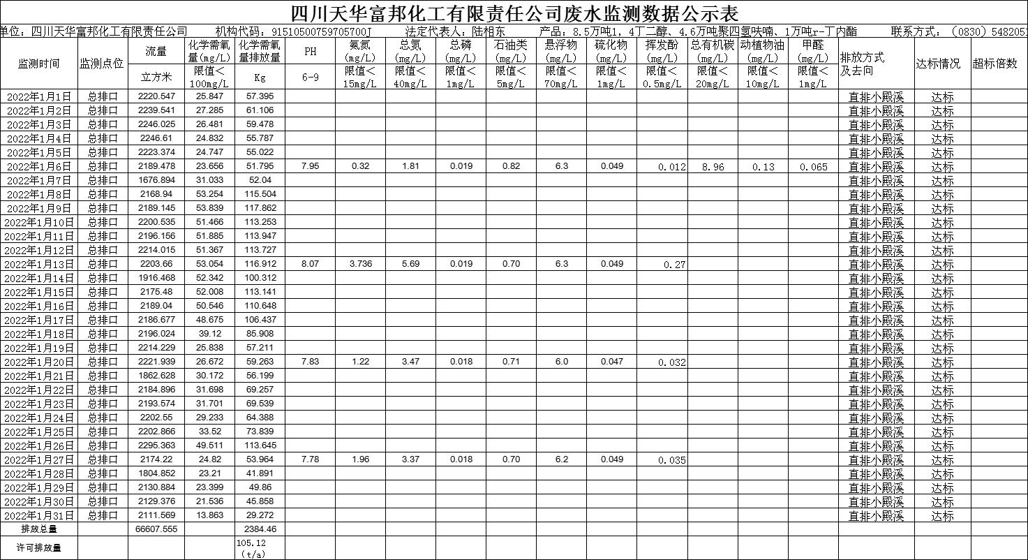 四川天華富邦有限責(zé)任公司2022年1月廢水監(jiān)測公示
