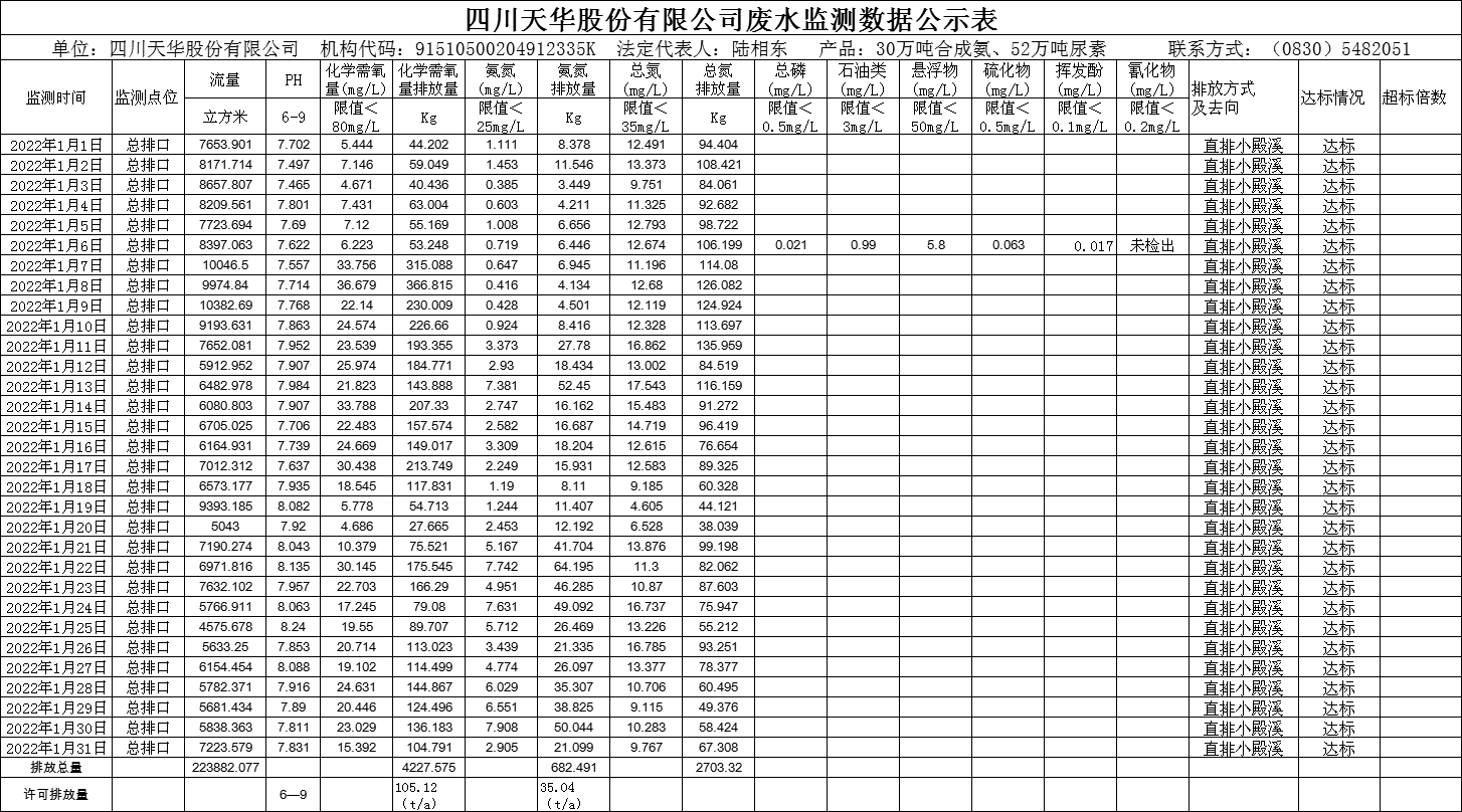 四川天華股份有限公司2022年1月廢水監測數據公示