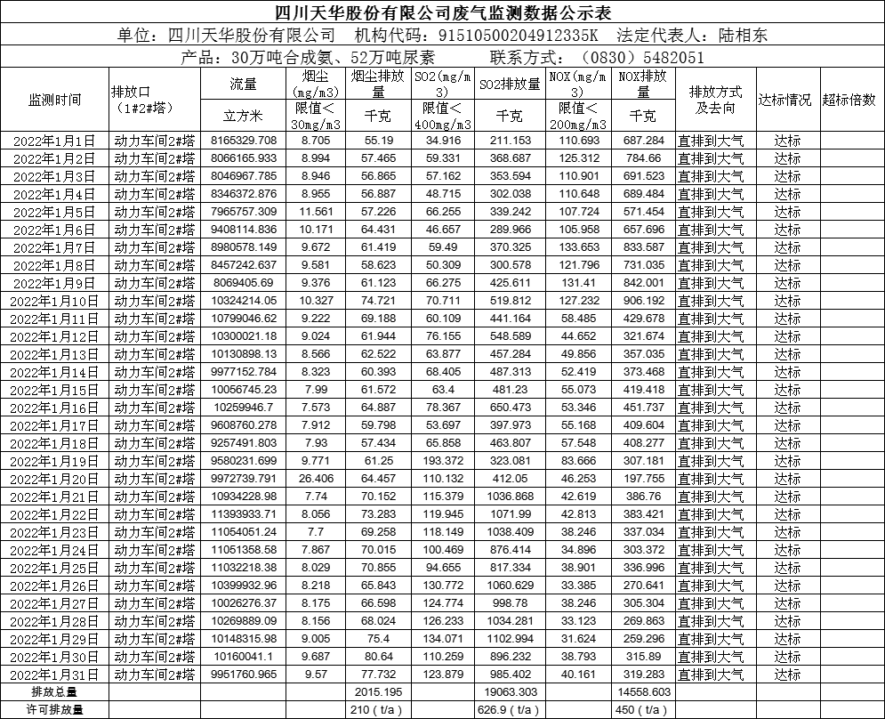 四川天華股份有限公司2022年1月廢氣監測公示